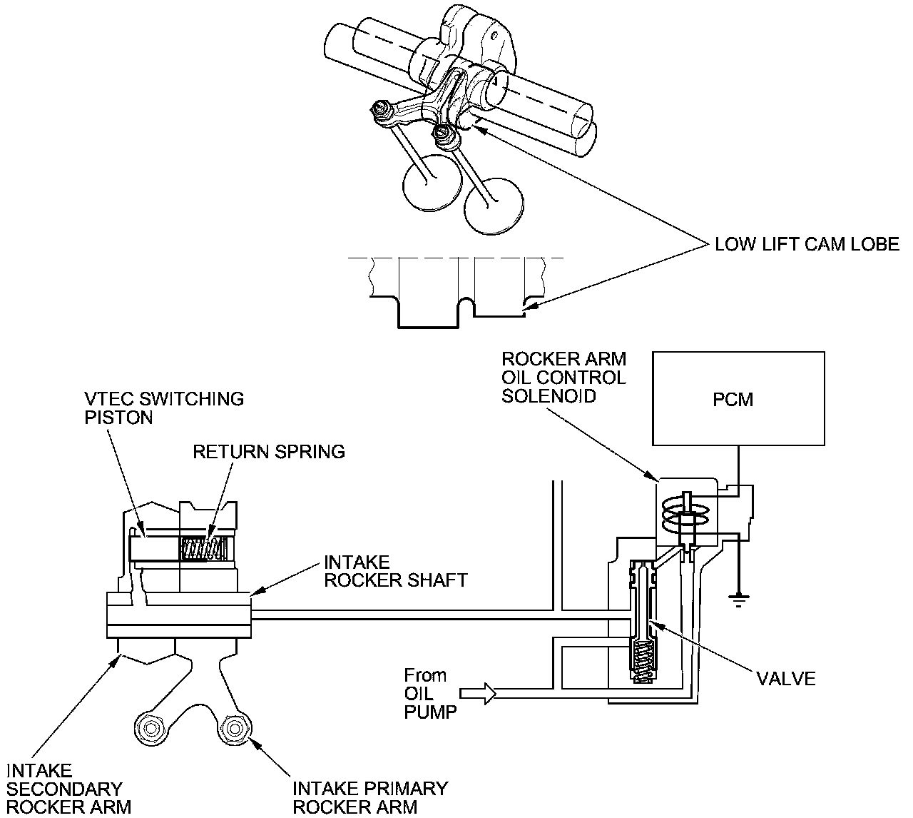 The rocker arm oil control solenoid is turned on by the PCM. Oil pressure from the rocker arm control solenoid enters into the intake secondary rocker arm via the rocker shaft, and it moves the VTEC switching piston in the intake secondary rocker arm. This causes the VTEC switching piston to slide into the primary rocker arm, locking the primary and secondary rocker arms together. Both intake rocker arms are lifted by the high lift cam lobe.