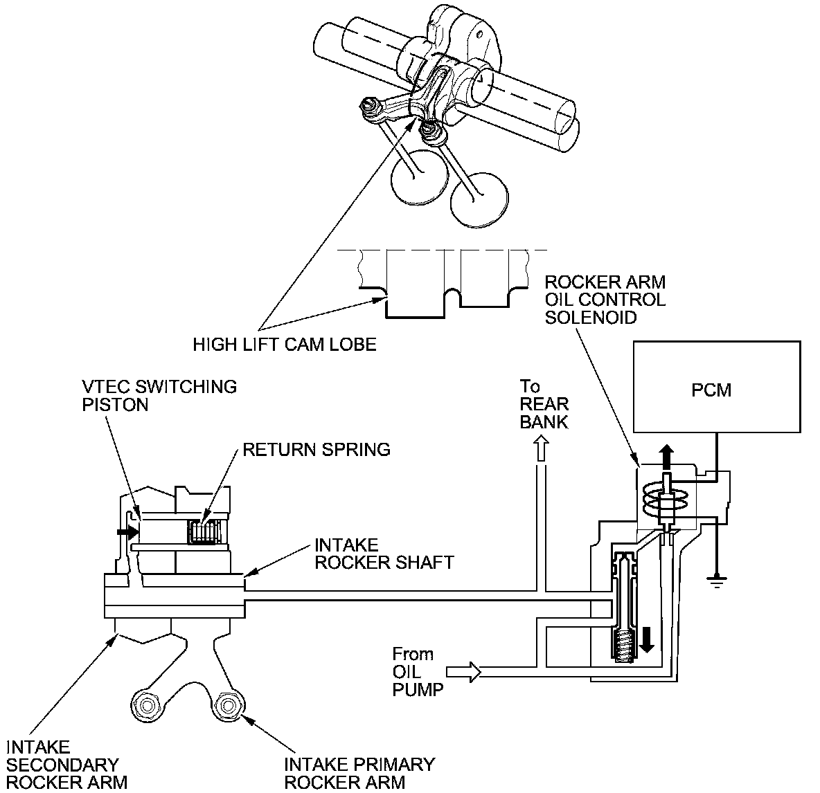 - The VTEC system oil pressure is switched by the rocker arm oil control valve changing the hydraulic circuit. The rocker arm oil control valve is controlled by the rocker arm oil control solenoid. The rocker arm oil pressure switch detects VTEC system oil pressure and sends this information to the PCM.