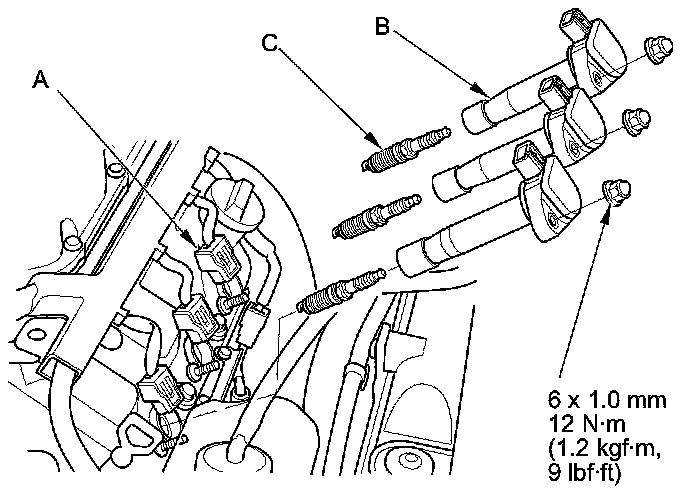 3. Remove the spark plugs (C) and inspect them Testing and Inspection.