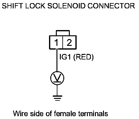 11. Release the brake pedal, and measure the voltage between shift lock solenoid connector terminals No. 1 and No. 2. The shift lever must be in P.