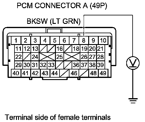 20. Measure the voltage between PCM connector terminal A8 and body ground while pressing the brake pedal and when the brake pedal is released.