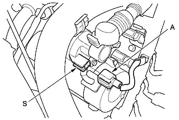 10. Make sure the shift lever is in P or N, then disconnect the connector (A) from the starter S terminal. Connect a jumper wire from the battery positive terminal to the S terminal.