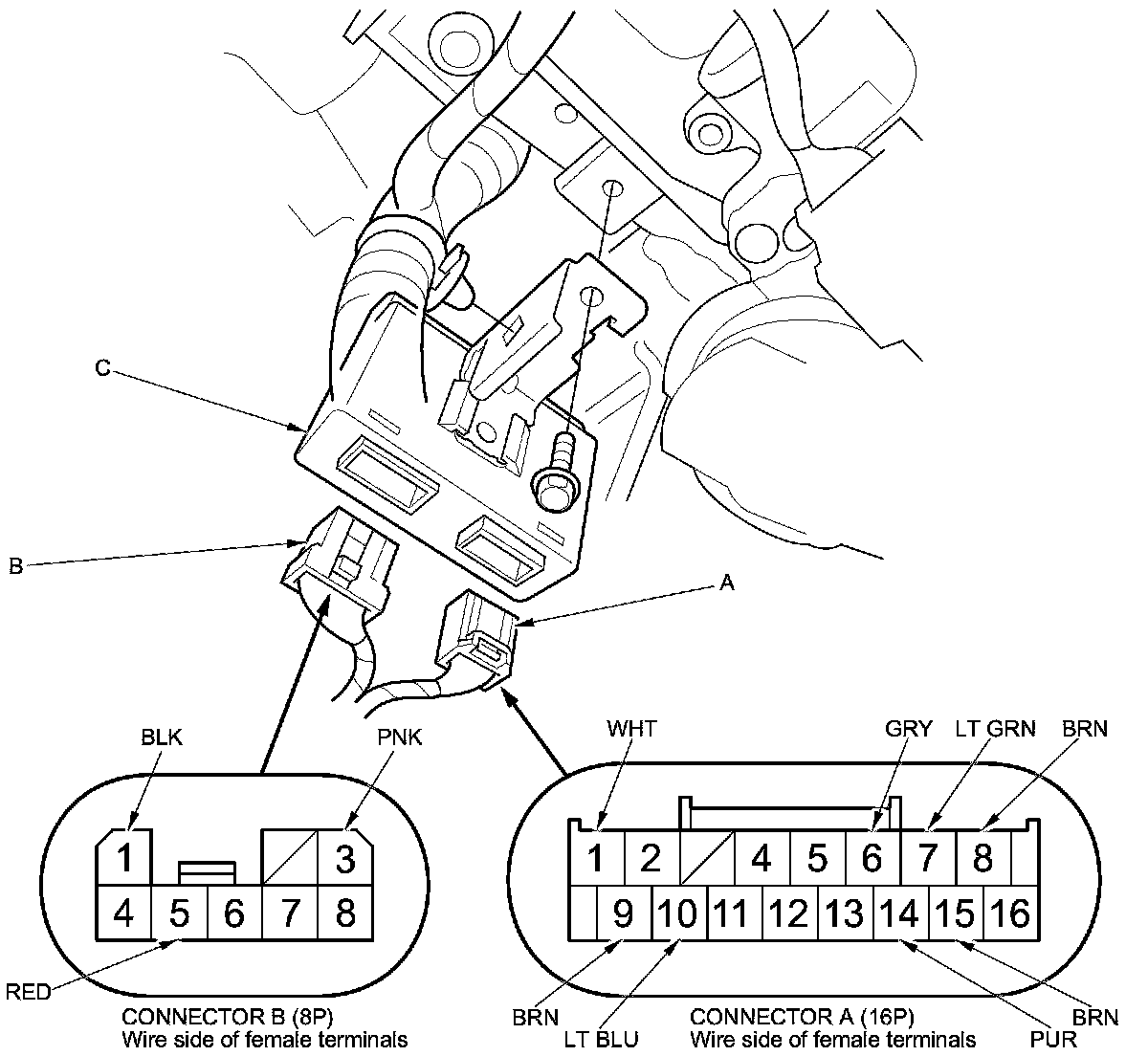 3. Disconnect the 16P connector (A) and 8P connector (B) from the power title/telescopic steering control unit (C).