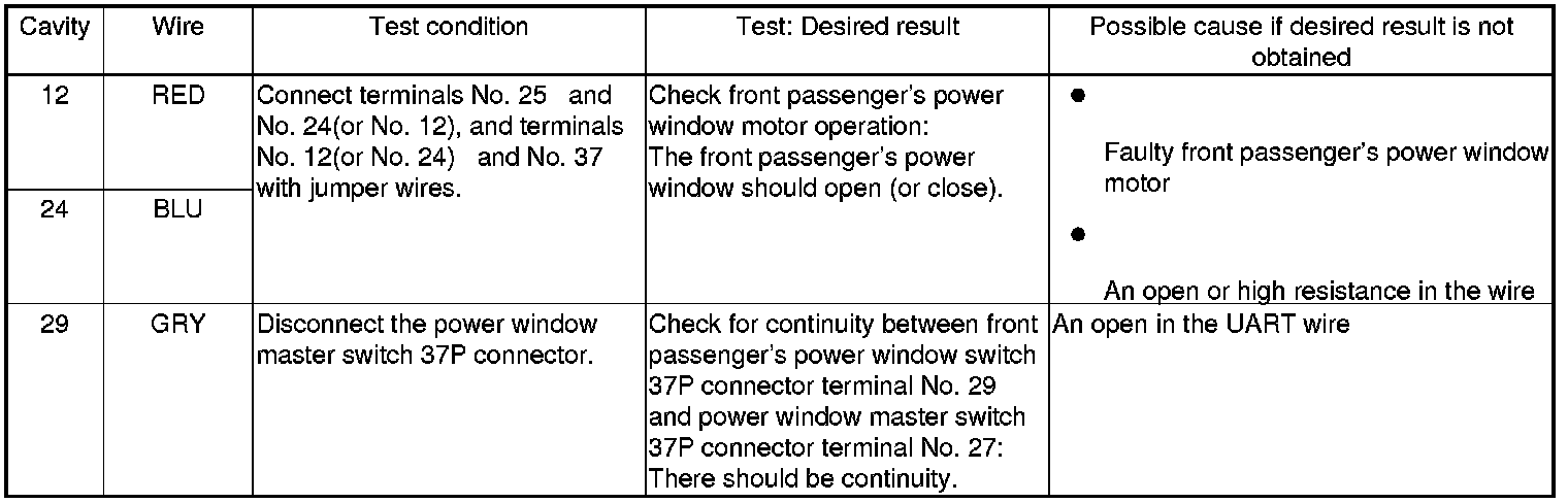 6. Reconnect the front passenger's power window switch connector to the front passenger's power window switch, and do the following input tests: