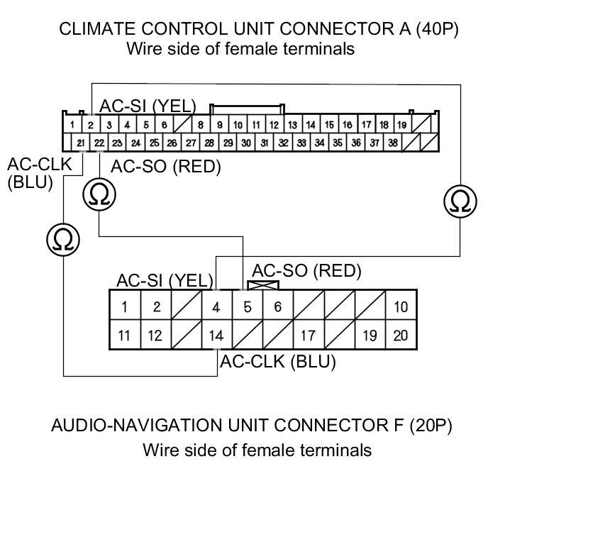7. Check for continuity between the following terminals of climate control unit connector A (40P) and audio-navigation unit connector F (20P).