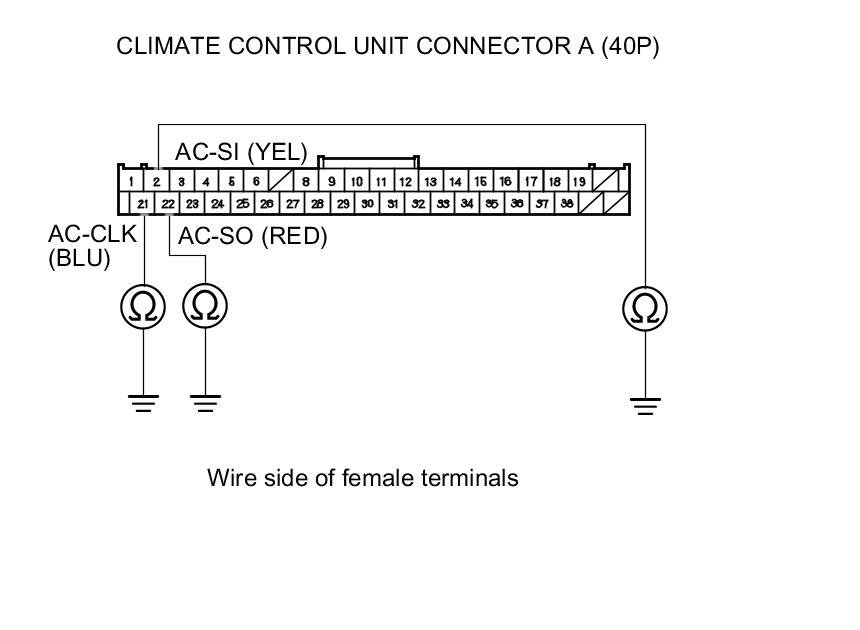 8. Check for continuity between body ground and climate control unit connector A (40P) terminals No. 2, No. 21, and No. 22 individually.