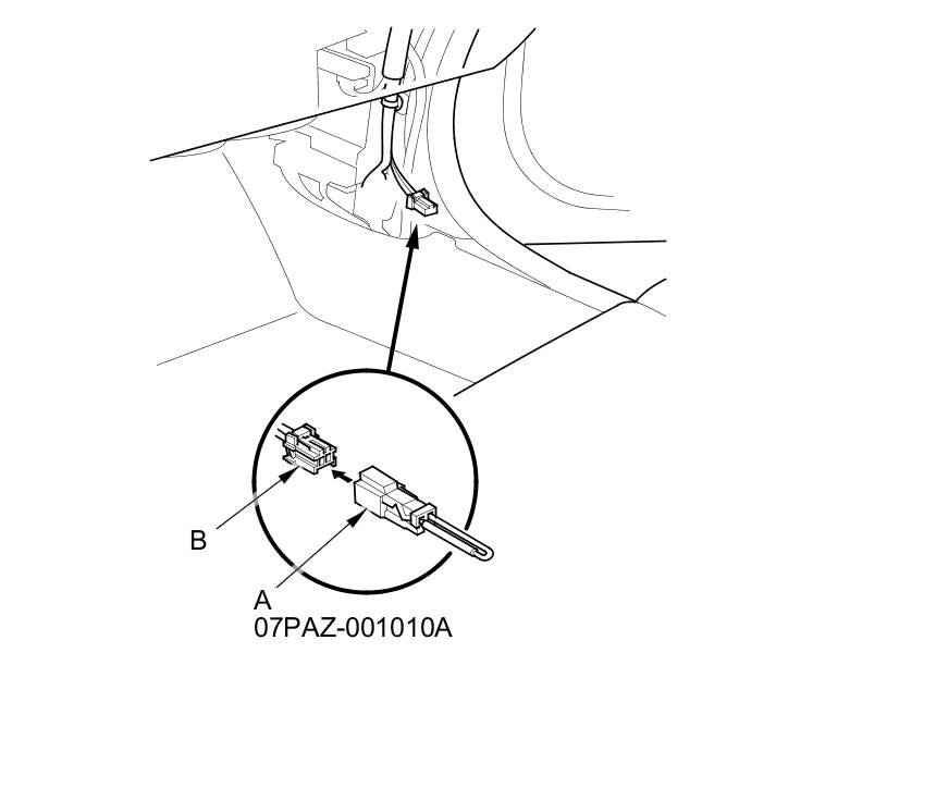 3. Connect the SCS service connector (A) to the navigation service connector (B) located by the right kick panel.