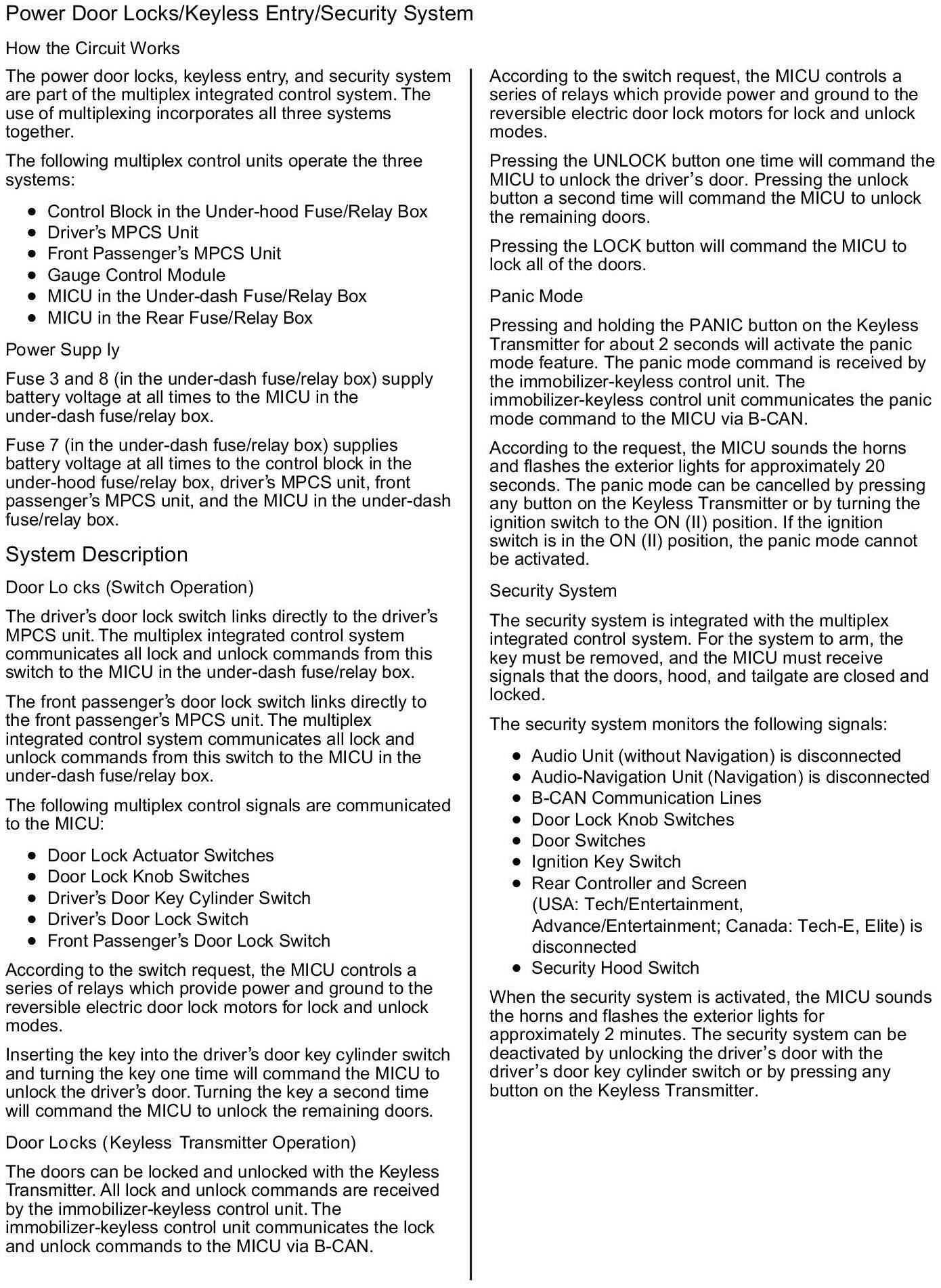 Home >> Acura >> 2012 >> MDX V6-3.7L >> Repair and Diagnosis >> Body and Frame >> Locks >> Keyless Entry >> Description and Operation >> How The Power Door Locks/Keyless Entry/Security System Circuit Works