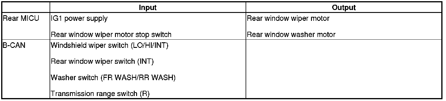The rear MICU controls the rear window wiper motor and washer motor based on inputs from each switch.