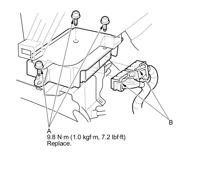 1. Install the SRS unit with new TORX bolts (A) using a TORX T30 bit, then connect the connectors (B) to the SRS unit; push them into position until they click.
