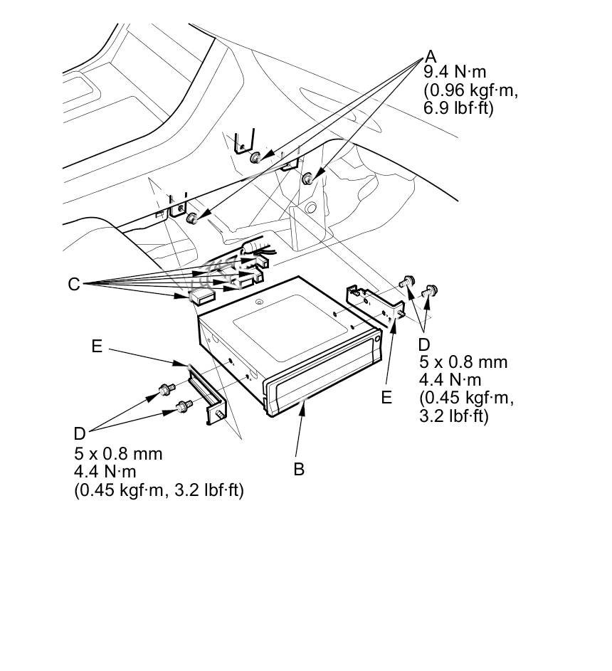 6. Disconnect the connectors (C), then remove the bolts (D) and the brackets (E).