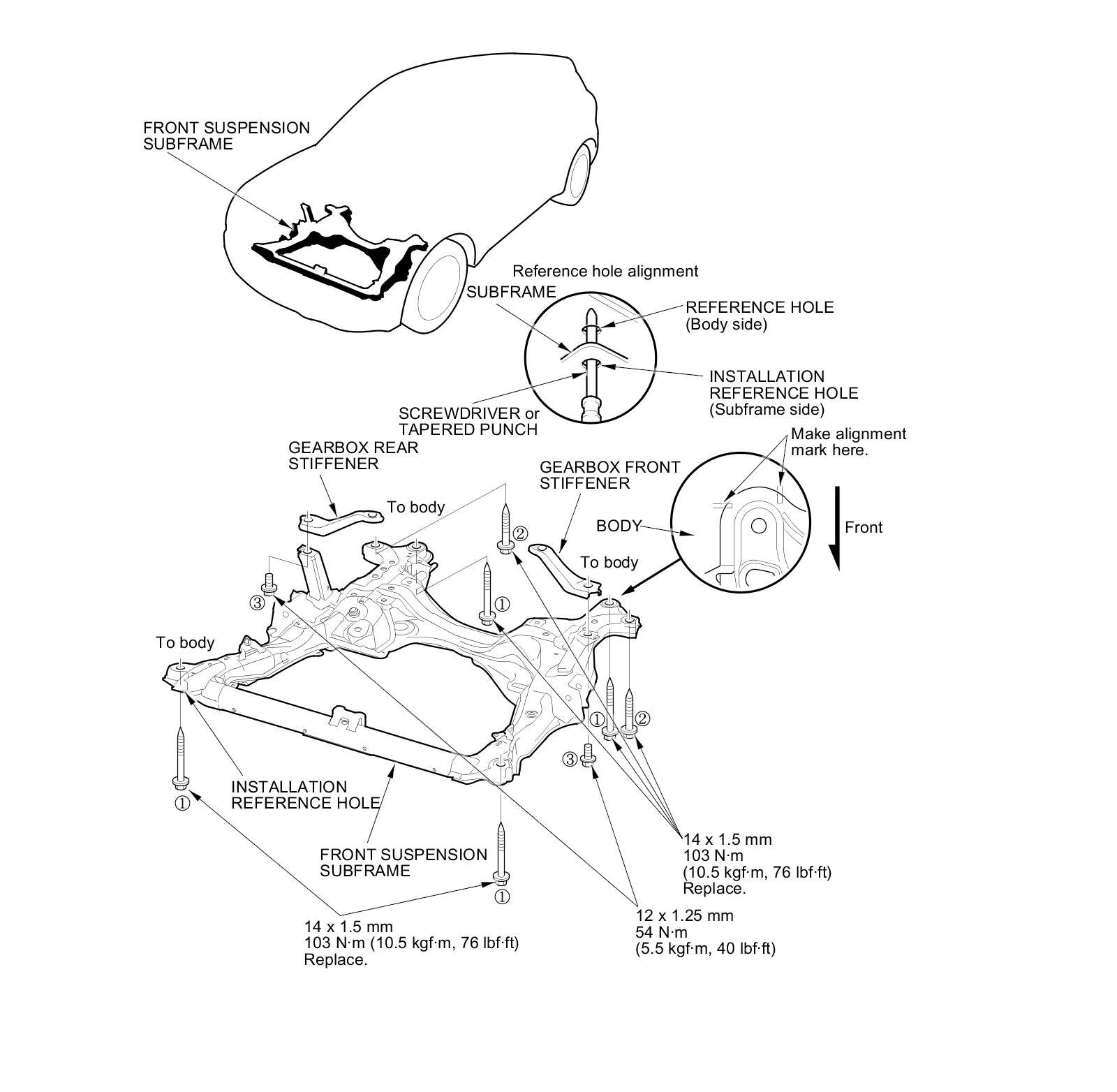 - When installing, align both installation reference holes in the subframe with both reference holes in the body using a screwdriver or tapered punch as a guide.