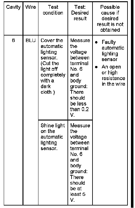 5. Reconnect the automatic lighting control unit connector, and do the following input tests: