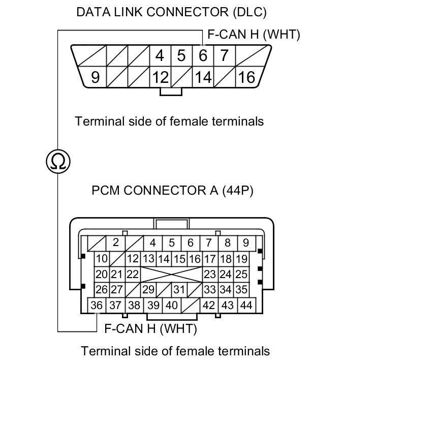 32. Check for continuity between PCM connector terminal A36 and DLC terminal No. 6.