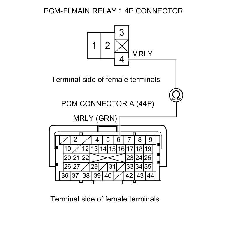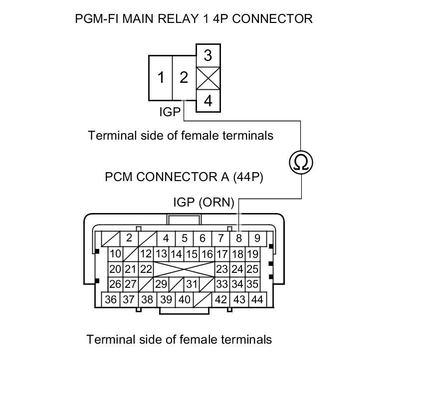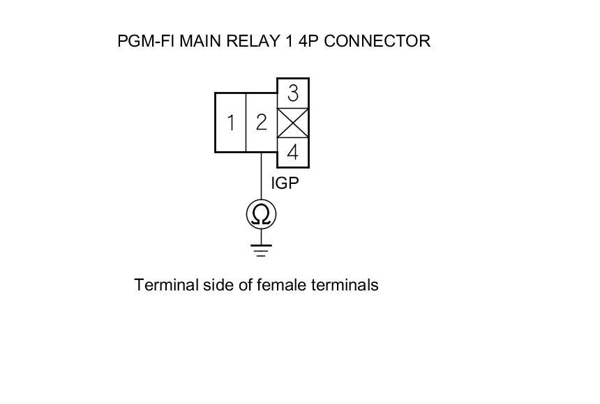 43. Check for continuity between PGM-FI main relay 1 4P connector terminal No. 2 and body ground.