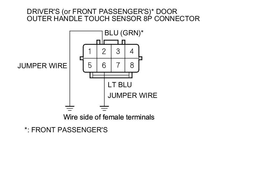13. Connect driver's (or front passenger's)* door outer handle touch sensor 8P connector terminals No. 2 and No. 6 to body ground with jumper wires.