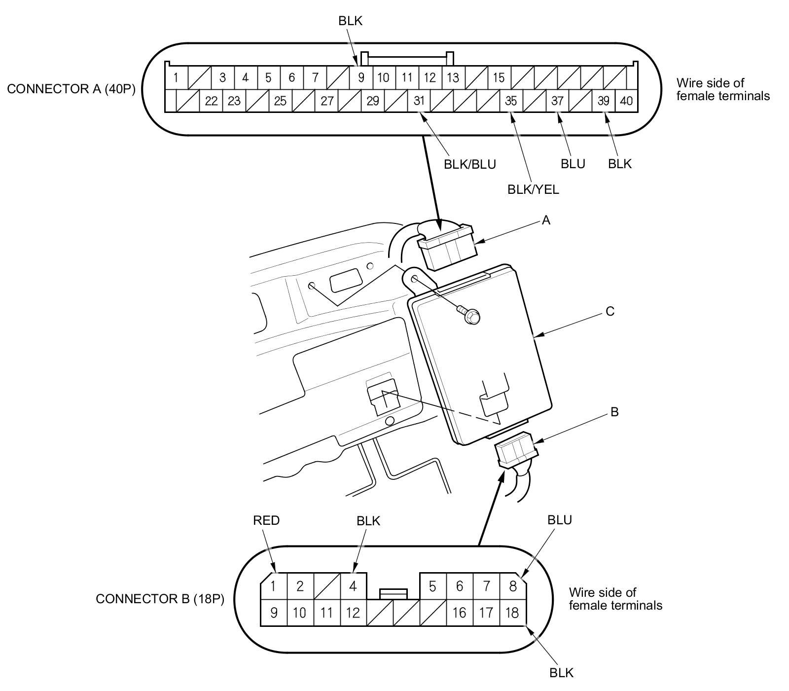 3. Disconnect the 40P connector (A) and 18P connector (B) from the power seat control unit (C).