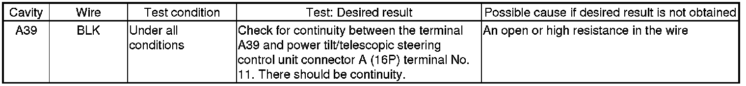 5. With the power seat control unit connectors still disconnected, disconnect power tilt/telescopic steering control unit connector A, and do the following input tests.