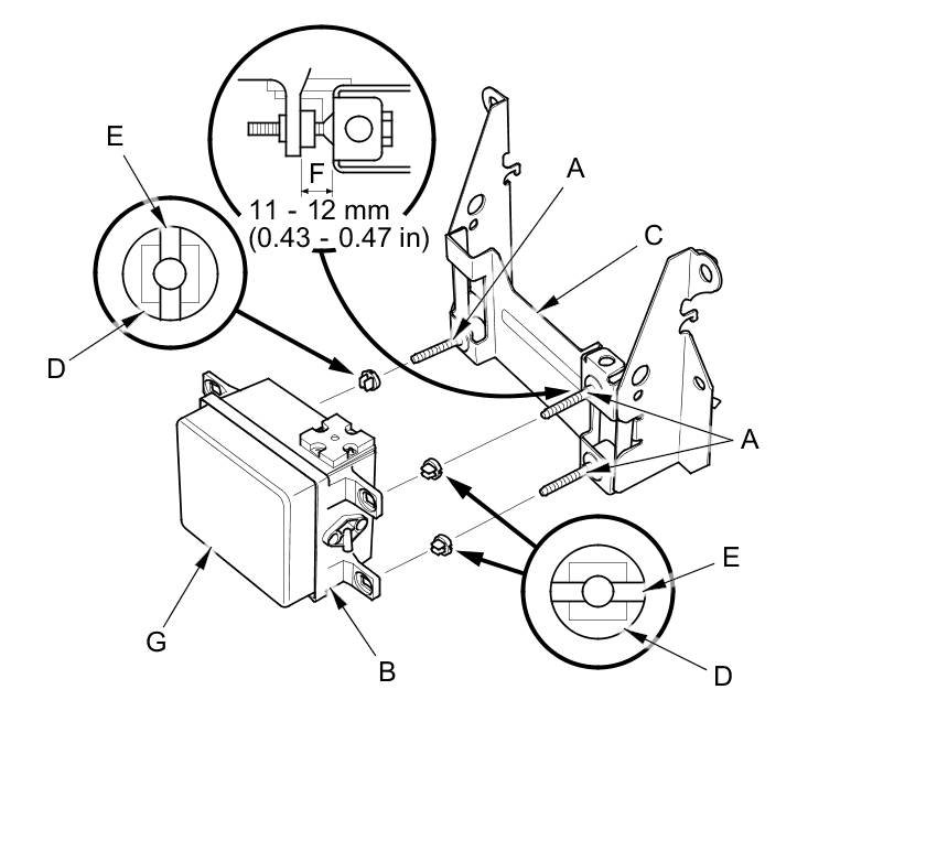 6. Tighten the main bracket bolts a little at a time until the clearance between the millimeter wave radar and the main bracket is 0.43-0.47 in (11-12 mm) (F). Make sure the millimeter wave radar is parallel with the main bracket.