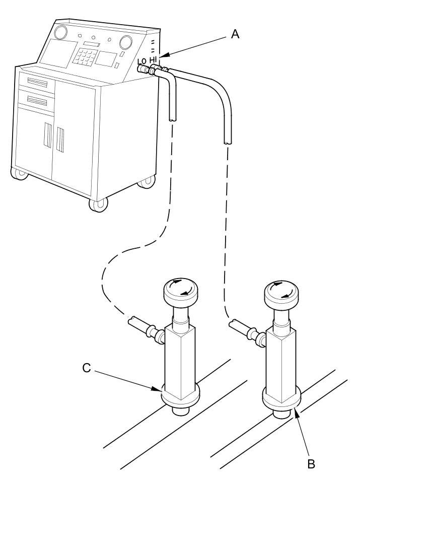 1. Connect an R-134a refrigerant recovery/recycling/charging station (A) to the high-pressure service port (B) and the low-pressure service port (C), as shown, following the equipment manufacturer's instructions.