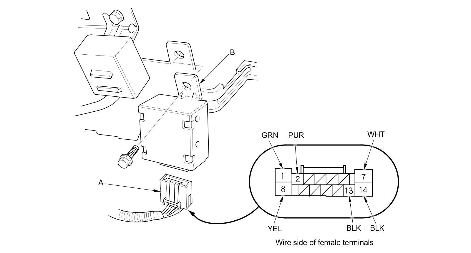 2. Disconnect the 14P connector (A) from the daytime running lights control unit (B).