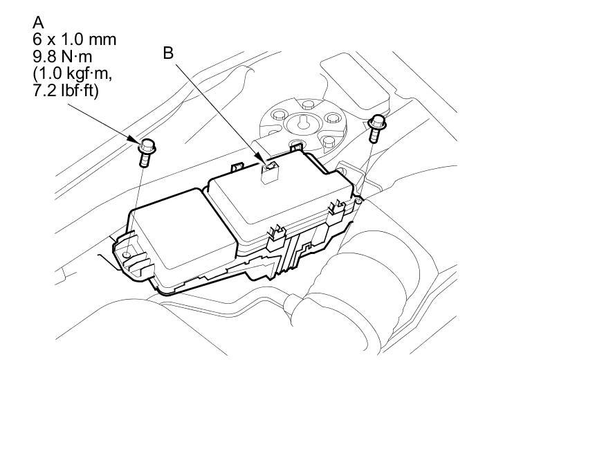 2. Remove the bolts (A) and clamp (B) securing the under-hood fuse/relay box.