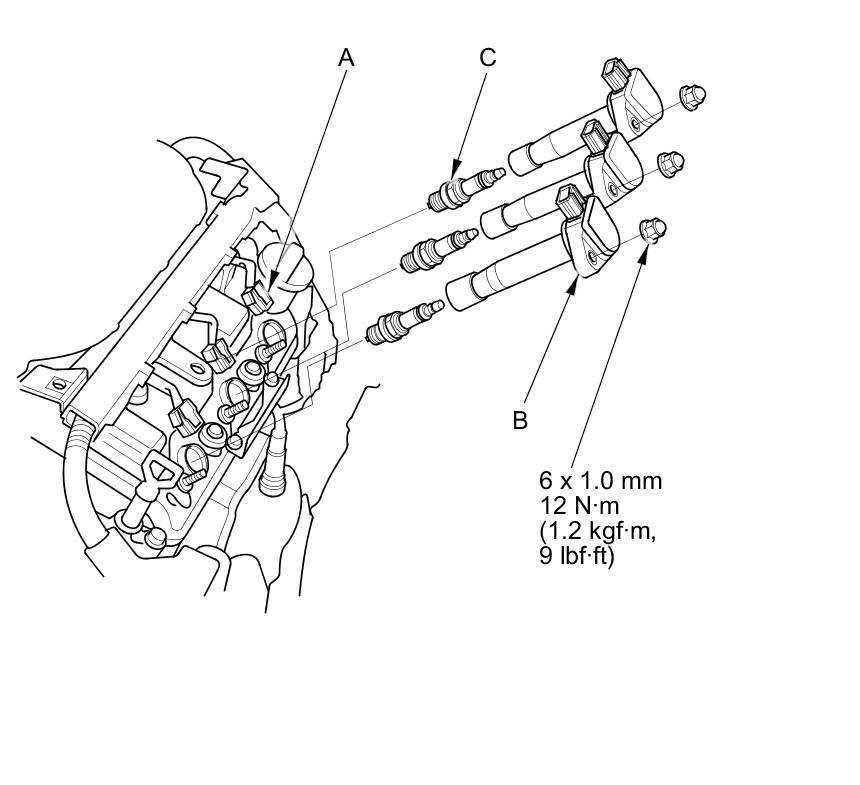 4. Disconnect the ignition coil connectors (A), then remove the front ignition coils (B).