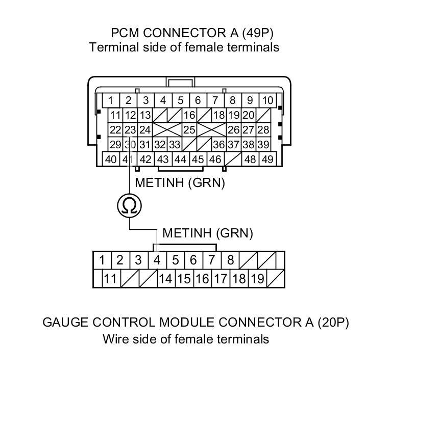 9. Check for continuity between PCM connector terminal A23 and gauge control module connector terminal A4.