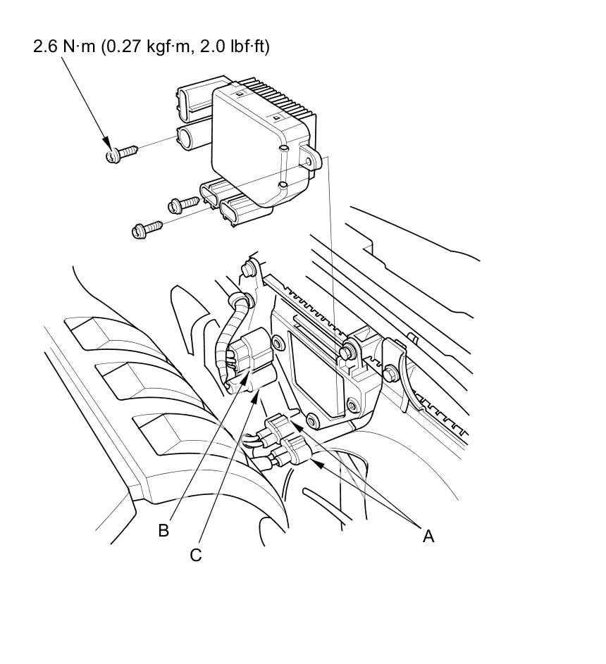 2. Disconnect the fan motor connectors (A), the 3P connector (B) and the 1P connector (C) from the RFC unit.
