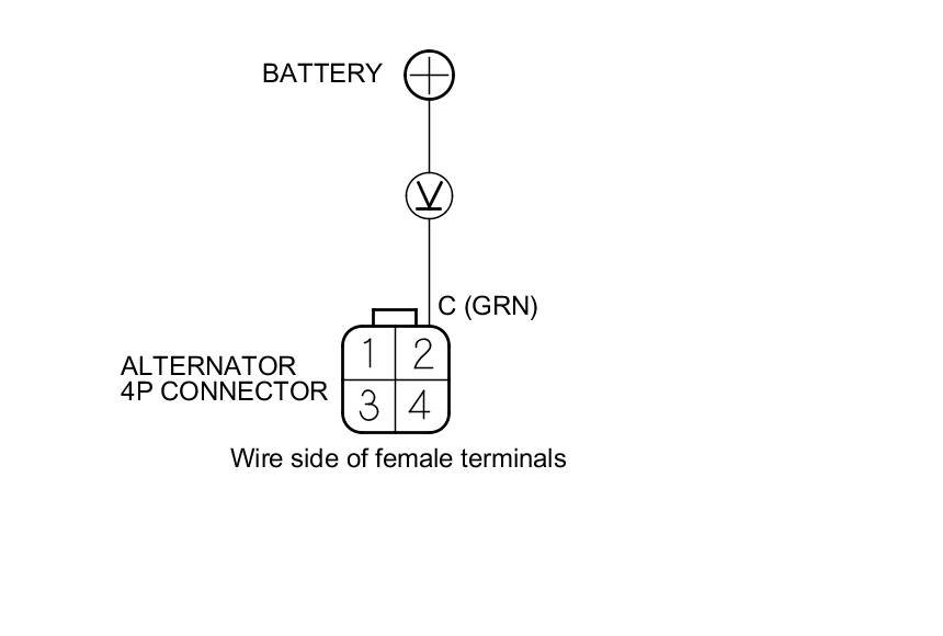 7. Measure the voltage between alternator 4P connector terminal No. 2 and the positive terminal of the battery.