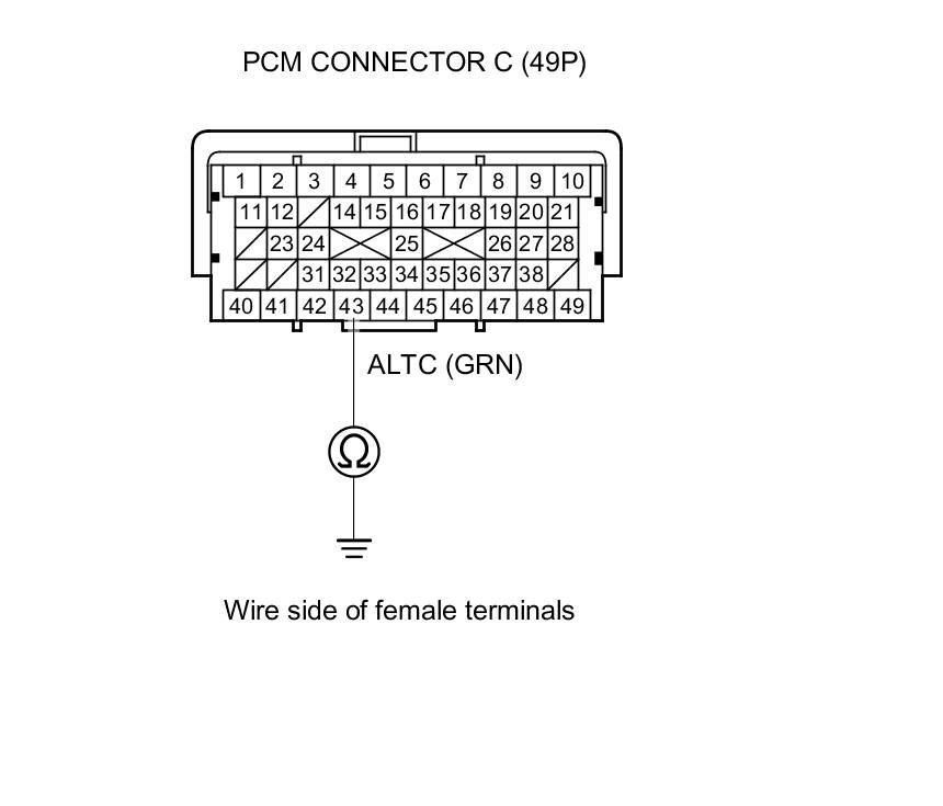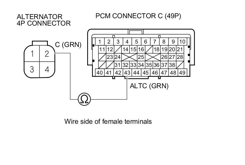 13. Check for loose terminals and connectors, then check for continuity between PCM connector terminal C43 and alternator 4P connector terminal No. 2.