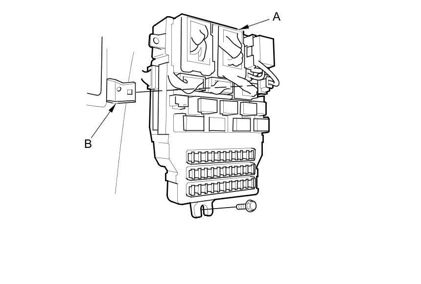 4. Remove the mounting bolt, release the tab (B) and pull the driver's under-dash fuse/relay box away from the body.