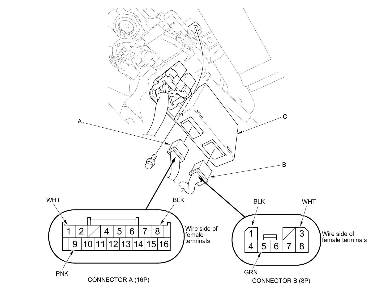 3. Disconnected the 16P connector (A) and the 8P connector (B) from the power tilt/telescopic steering control unit (C).