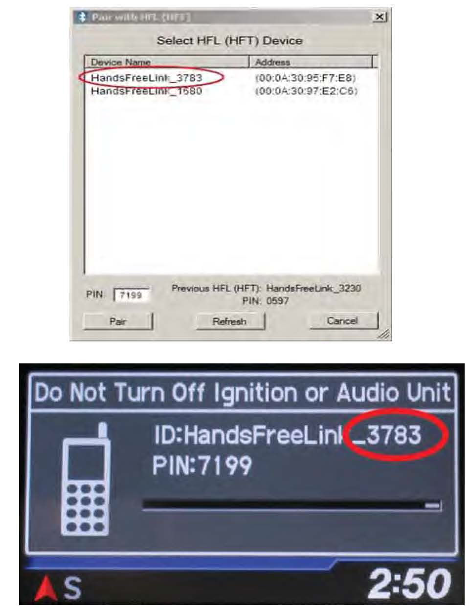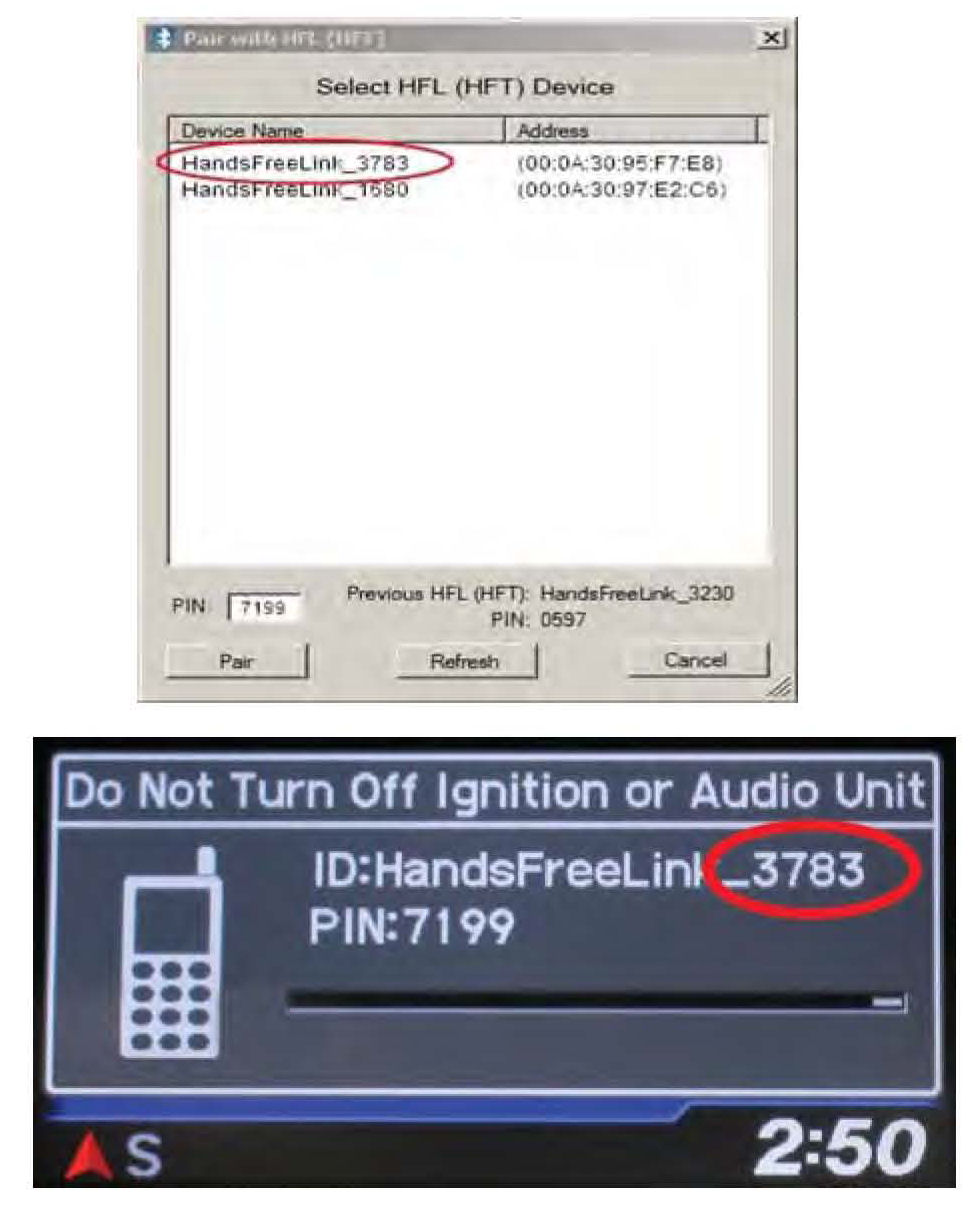 10. In the HFL update tool, select the correct Bluetooth device (if more than one appears) that matches the HandsFreeLink ID code shown in the vehicle's display screen.