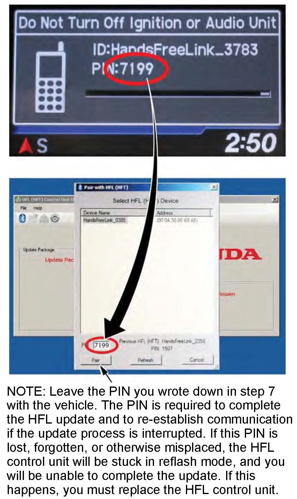 The original PIN is required to complete the HFL update and to re-establish communication if the update process is interrupted. If the original PIN is lost, forgotten, or otherwise misplaced, and an interruption to the reflash process occurs, the HFL control unit will remain stuck in reflash mode, and you will be unable to complete the HFL update. If this happens, you must replace the HFL control unit.
