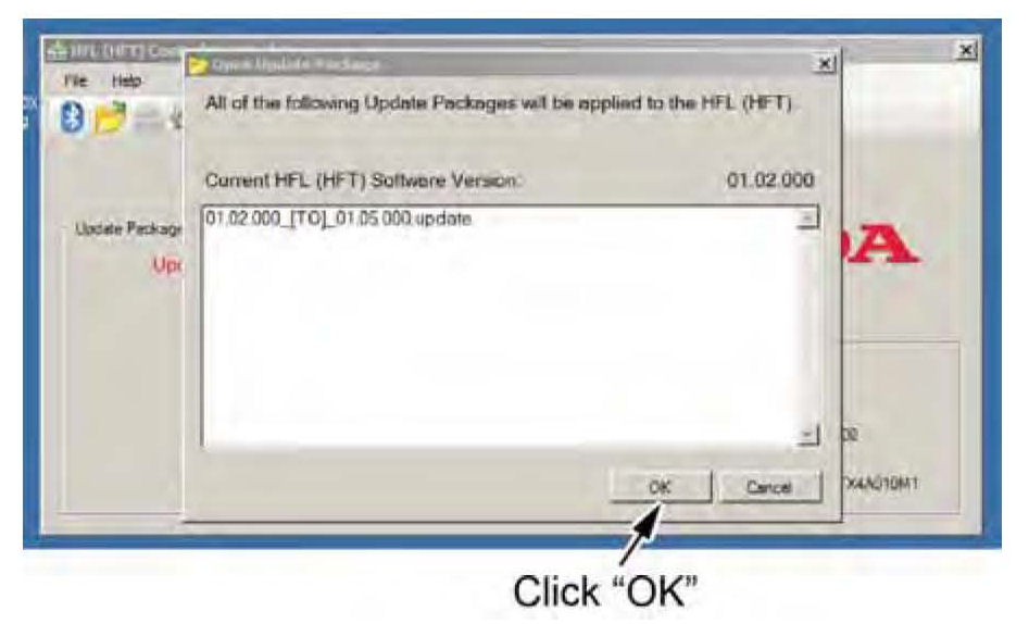 13. In the HFL update tool, the Open Update Package" window pops up when the Bluetooth pairing process is complete. The HFL update tool automatically determines which version of the HFL software is present, and which updates are on the HDS laptop. Click OK to begin the HFL control unit reflash process.