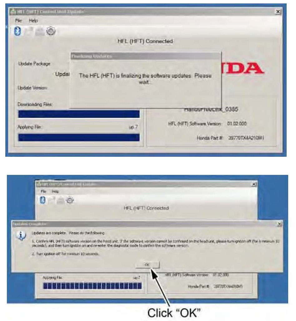 15. On the HFL update tool, a pop-up window alerts you when the reflash process is finalizing, and then another pop-up informs you that the reflash process is complete. Click OK.