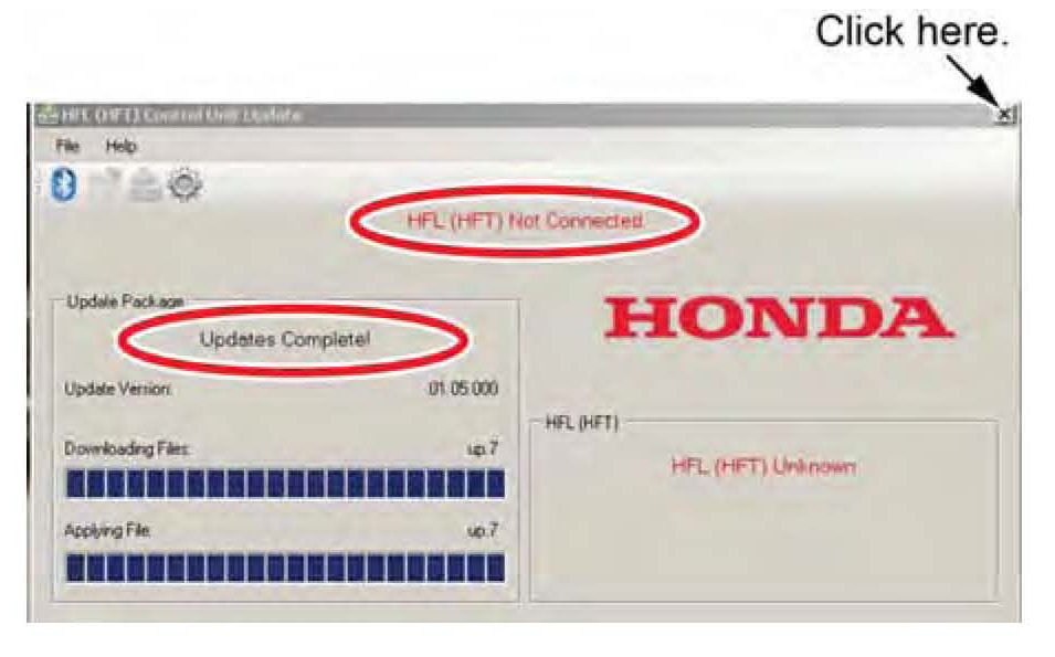 16. The HFL update tool will indicate the update is complete, and automatically disconnects the Bluetooth connection from the HFL control unit. Close the HFL update tool by clicking on the "X" in the upper right-hand corner.