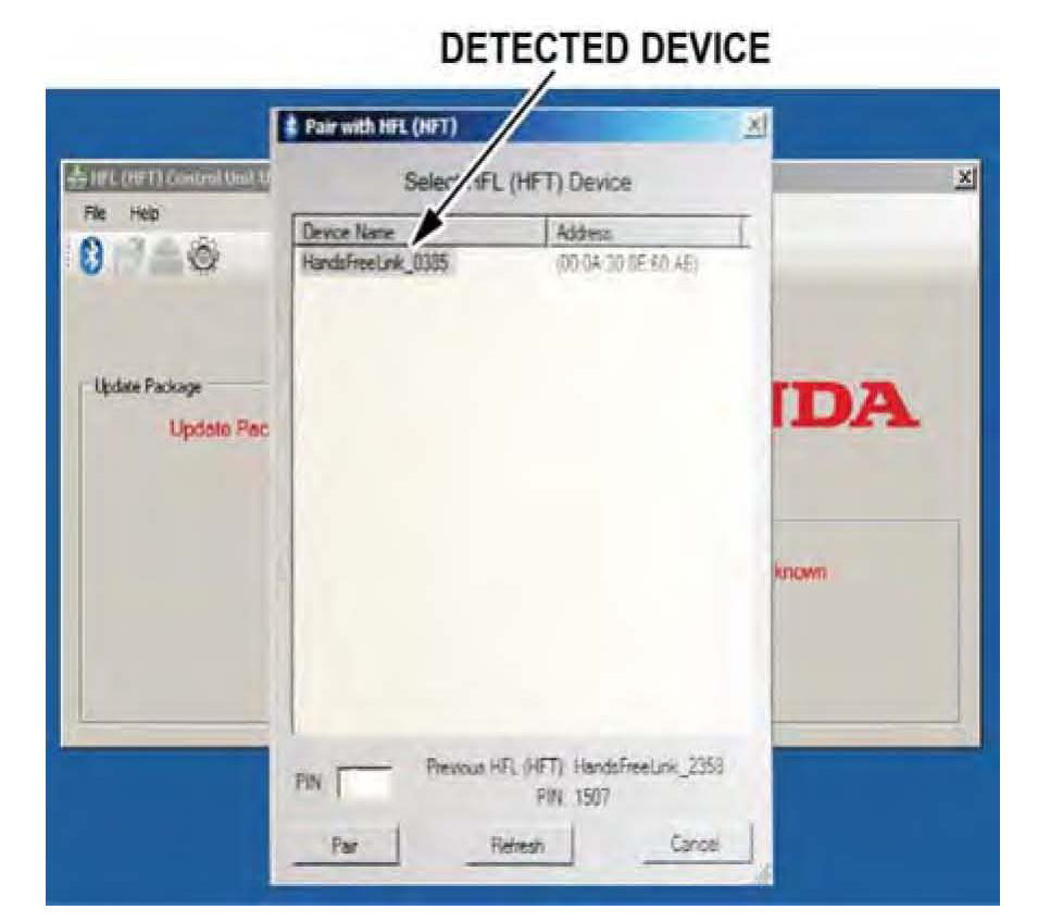 24. In the HFL update tool, the Pair with HFL" window pops up. Wait a few seconds for the display to show All Detected Bluetooth Devices." If no devices are found after 30 seconds, click on the Refresh button.