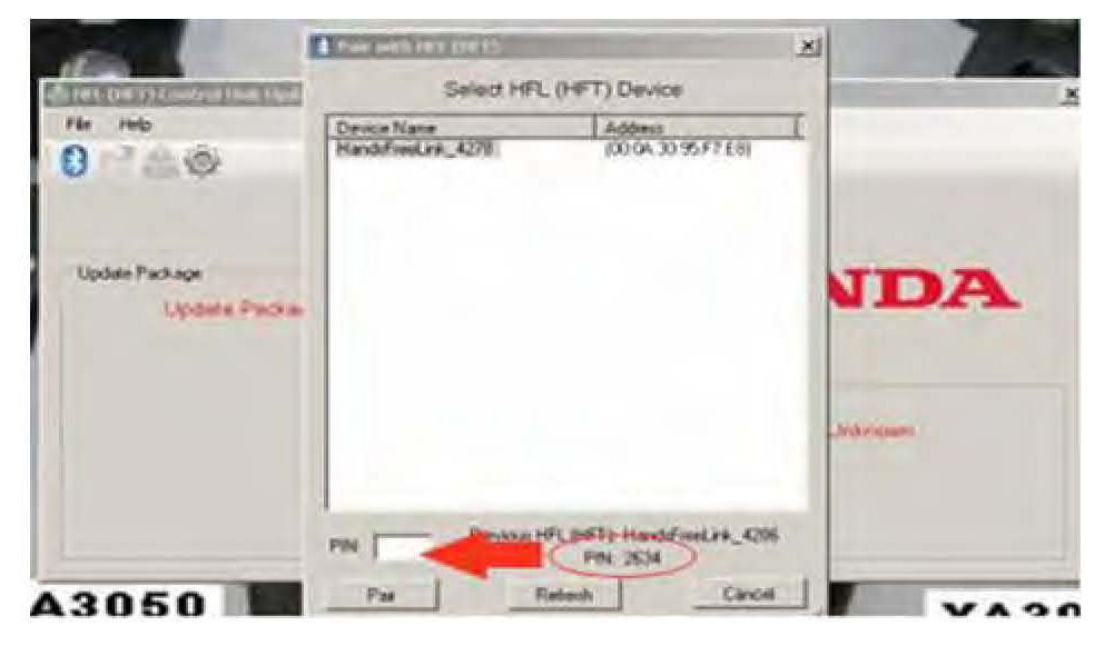 11. In the HFL update tool, enter the four-digit PIN from the vehicle's display screen into the lower left-hand corner of the pop-up window. Click on Pair to begin the pairing process.