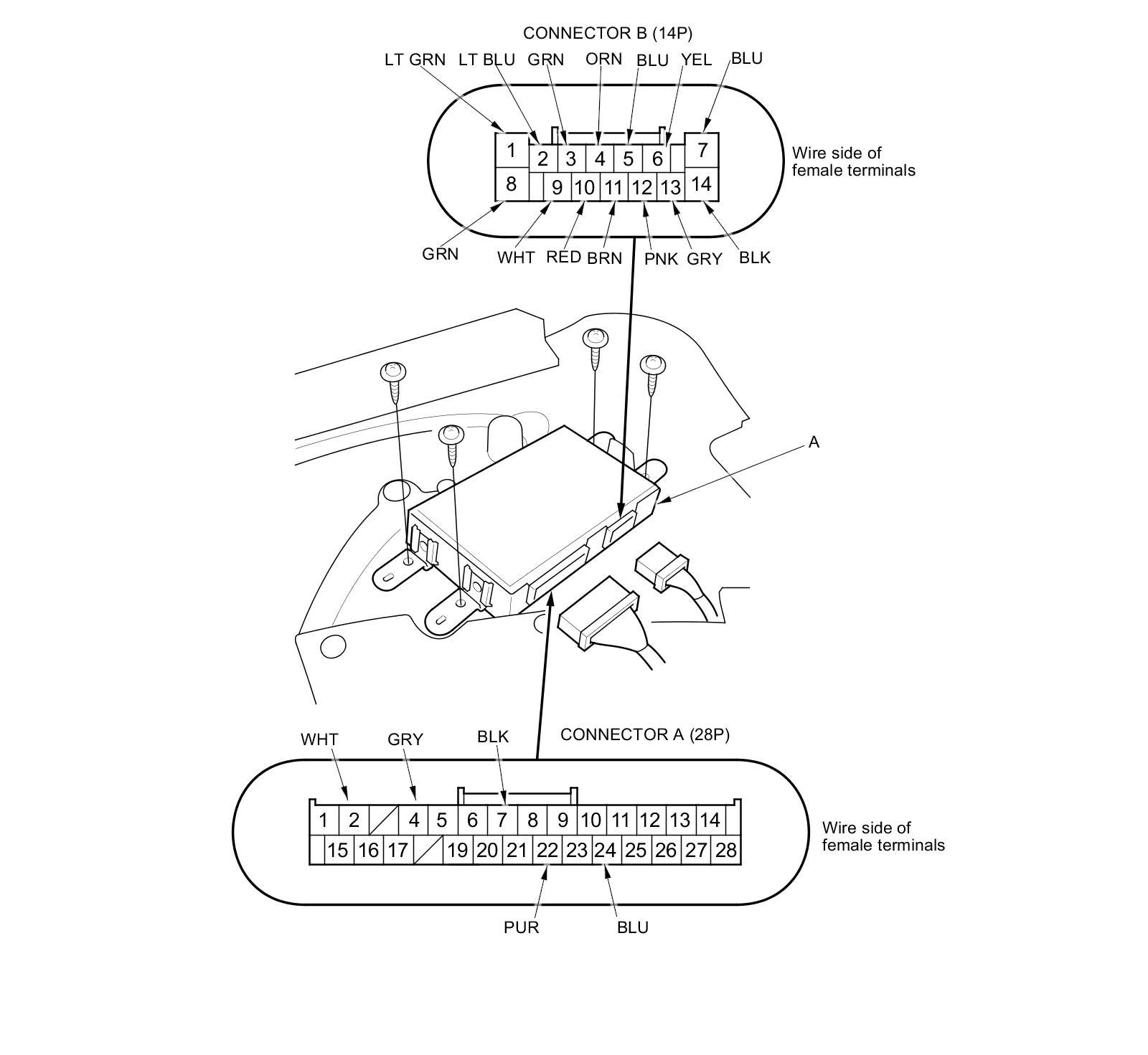 3. Disconnect front passenger's MPCS unit (A) connectors A (28P) and B (14P).