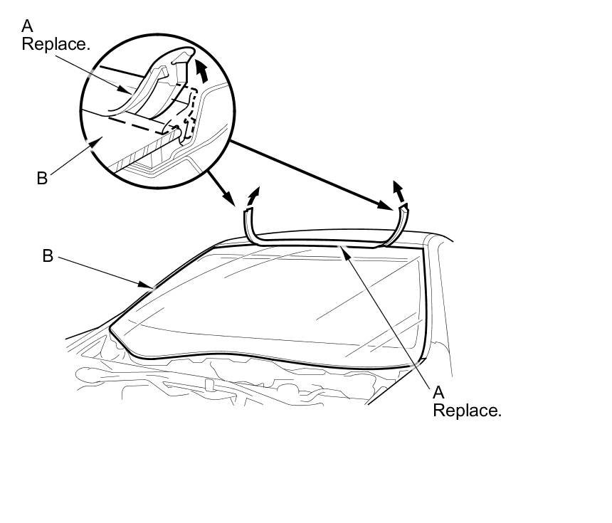 2. Remove the windshield molding (A) from the upper edge of the windshield (B). If necessary, cut the windshield molding with a utility knife.