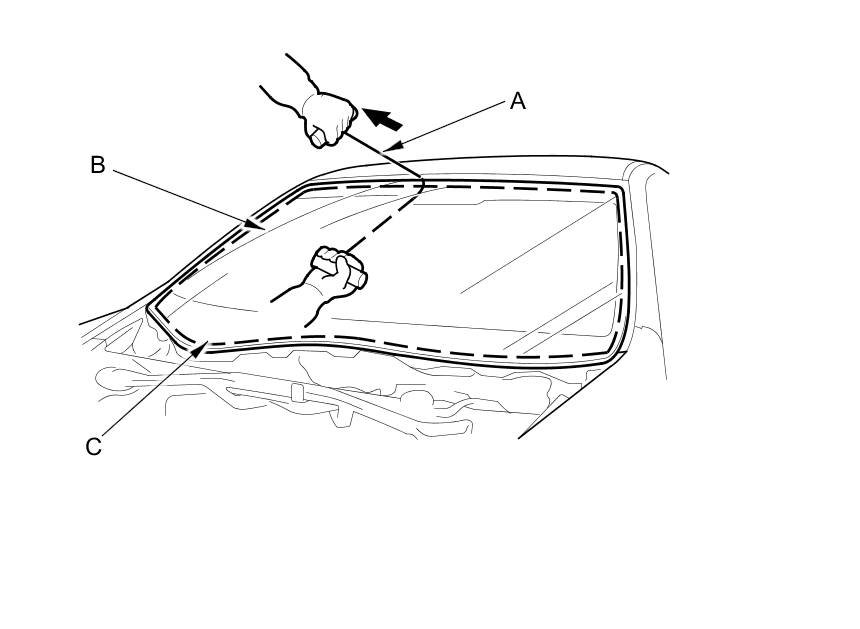 6. With a helper on the outside, pull the piano wire (A) back and forth in a sawing motion. Hold the piano wire as close to the windshield (B) as possible to prevent damage to the body and the dashboard. Carefully cut through the rubber dam and the adhesive (C) around the entire windshield.