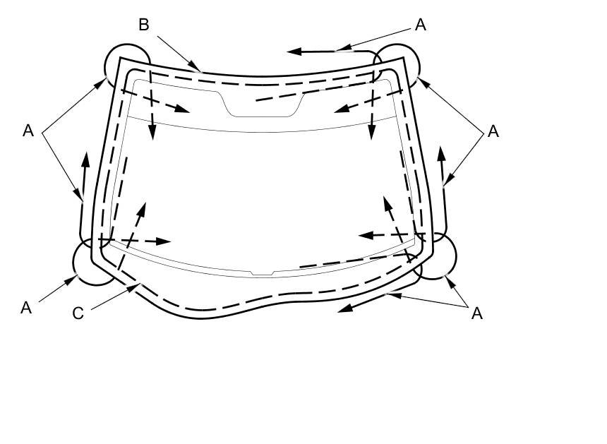 16. Apply a light coat of glass primer to the windshield (A) along the edge of the rubber dams (B) and the windshield molding (C) as shown, then lightly wipe it off with gauze or cheesecloth: