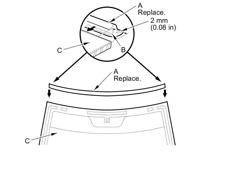 12. Attach the windshield molding (A) with adhesive tape (B) to the upper edge of the windshield (C). Be careful not to touch the windshield where the adhesive will be applied.