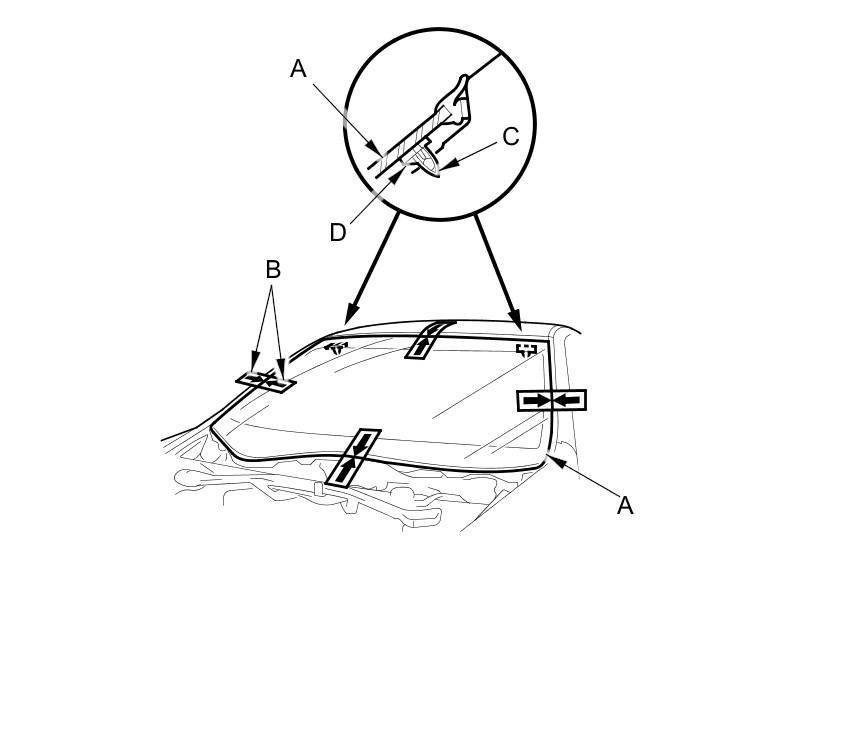 11. Apply glass primer to the upper clip mounting areas on the windshield (A), and let it dry. Remove the adhesive backing, and attach the upper rubber dam (B), the lower rubber dam (C), and the upper clips (D) to the inside face of the windshield as shown: