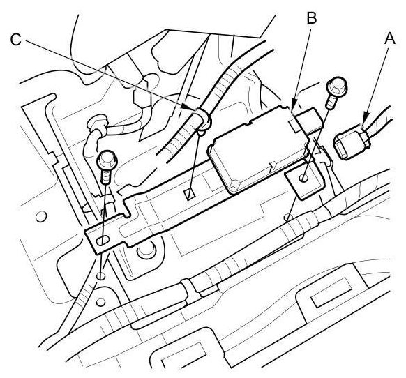 2. Disconnect the 3P connector (A) from RF unit (B) and remove the harness clip (C).