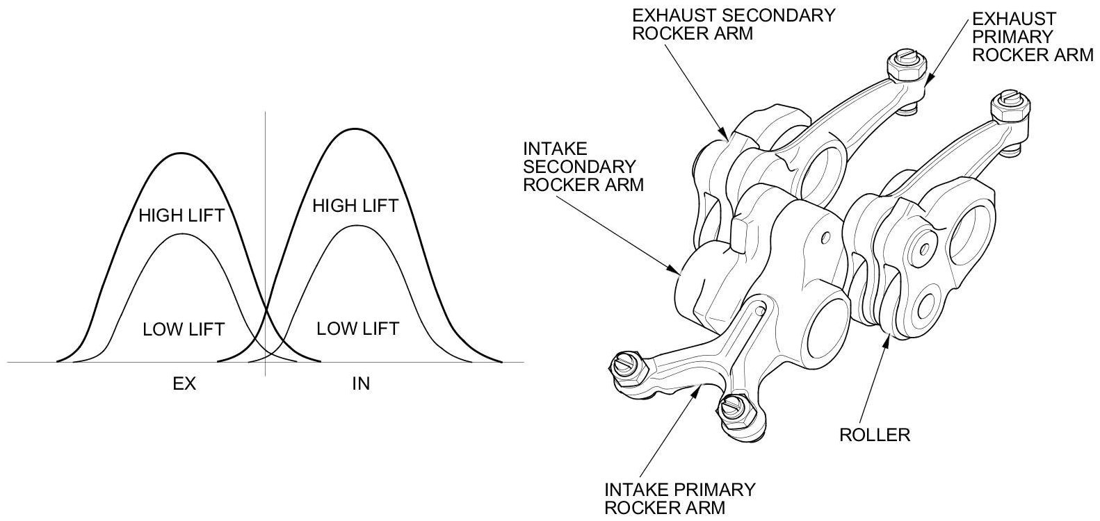 - Both the intake valve side and the exhaust valve side have primary and secondary rocker arms. These rocker arms are locked and separated to change the cam profile by switching the oil passages. Roller rockers are used to minimize mechanical friction.