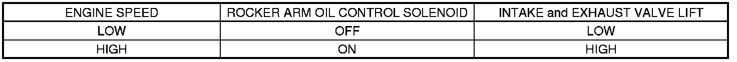 The rocker arm oil control solenoid is turned off by the ECM/PCM. Oil pressure from the rocker arm oil control valve does not enter the rocker shaft. The primary and secondary rocker arms are separated by a return spring and lifted by the low lift cam lobe.