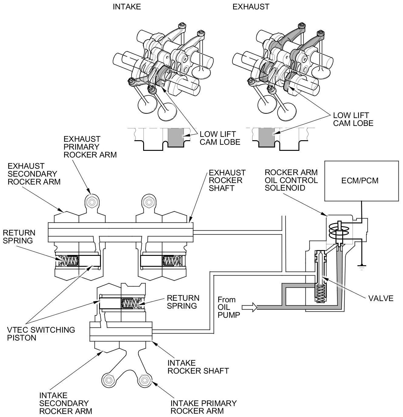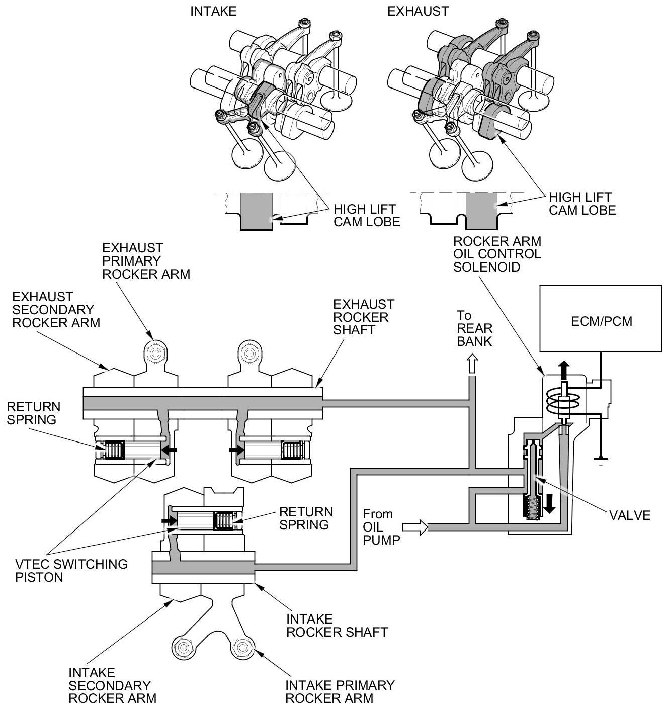 The rocker arm oil control solenoid is turned on by the ECM/PCM. Oil pressure from the rocker arm control solenoid enters into the intake secondary rocker arm and the exhaust primary rocker arm via the rocker shaft, and it moves the VTEC switching piston into the intake secondary rocker arm and the exhaust primary rocker arm. This causes the VTEC switching pistons to lock both rocker arms (primary and secondary) together. Both rocker arms are then lifted by the high lift cam lobe.